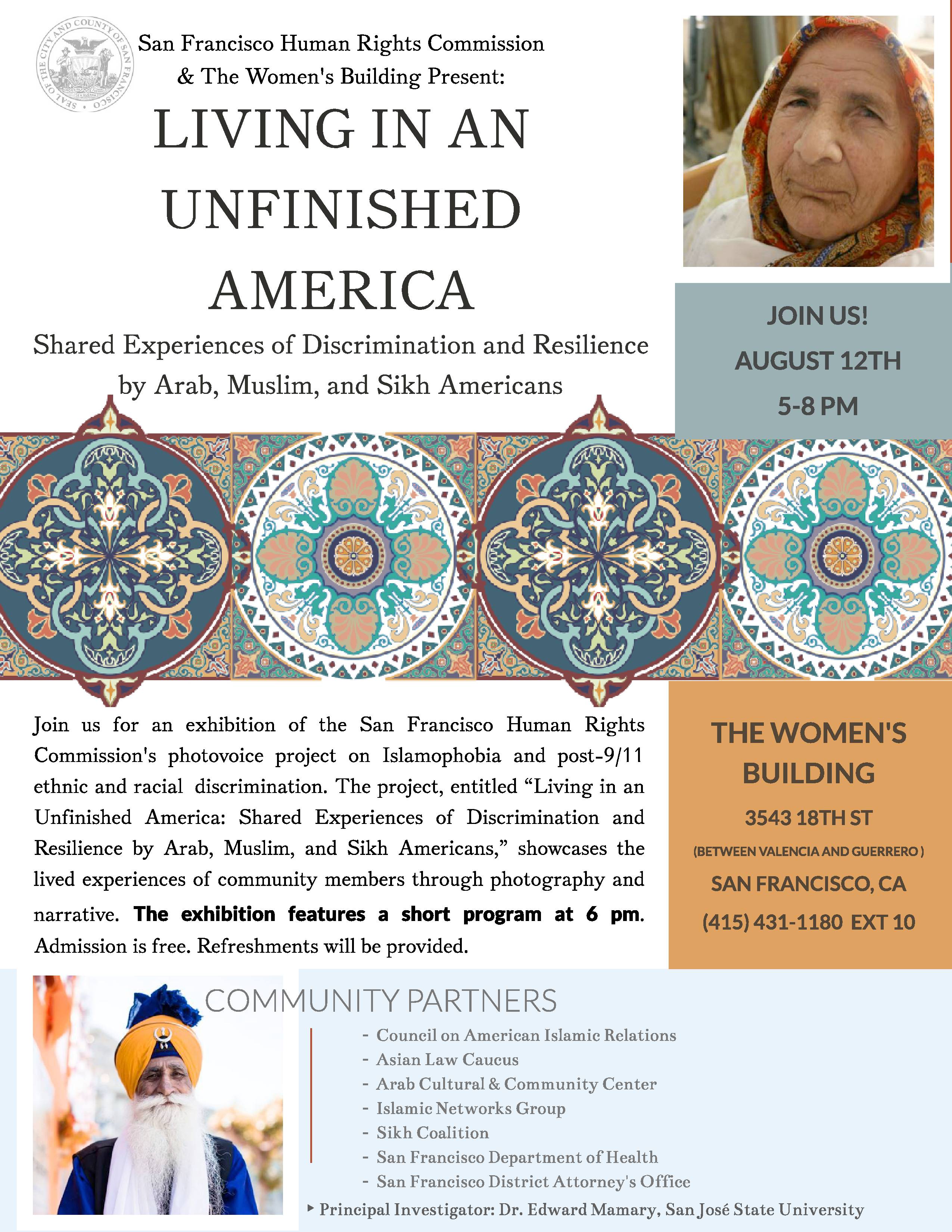 Islamophobia and post-9/11 ethnic and racial discrimination. The project, entitled “Living in an Unfinished America: Shared Experiences of Discrimination and Resilience by Arab, Muslim, and Sikh Americans,” showcases the lived experiences of community members through photography and narrative.